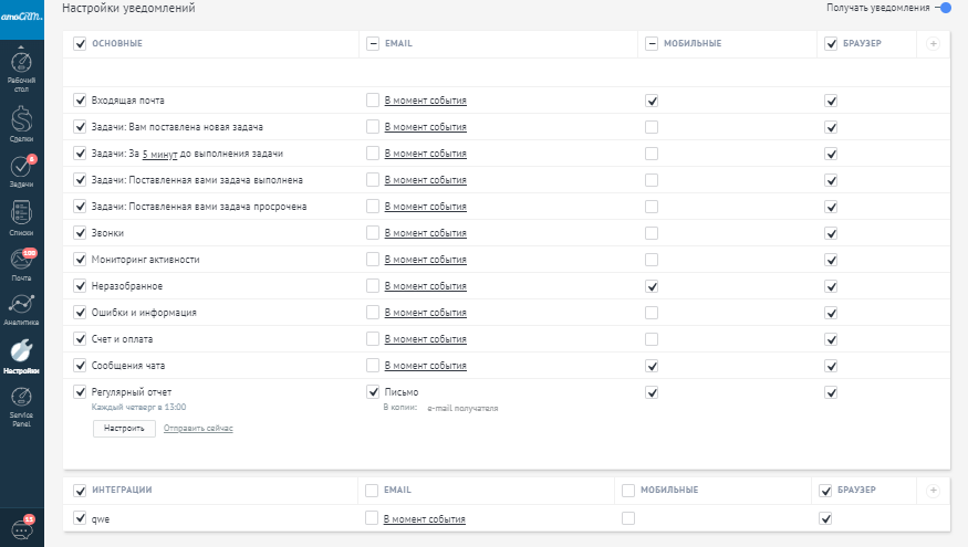 Если вы хотите получать уведомления на компьютере, убедитесь, что они также настроены через ваш профиль. Центр уведомлений в amoCRM предоставляет вам информацию о: